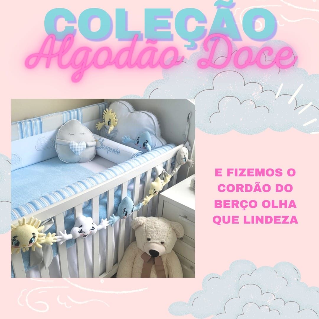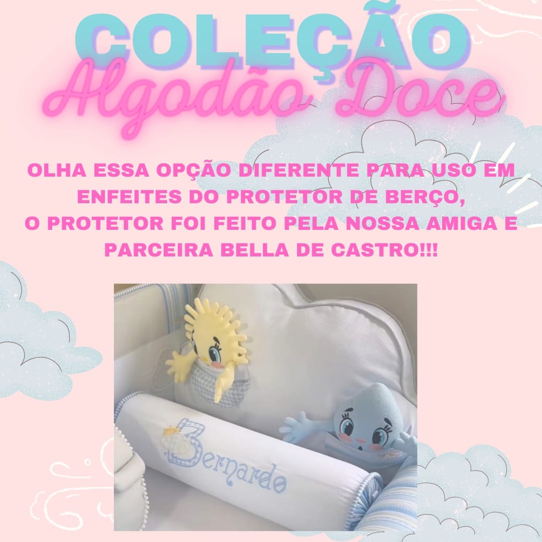 A Coleção Algodão Doce nasceu de uma inspiração delicada e especial, combinando a leveza dos elementos do céu com um toque romântico e sofisticado. Composta por 5 personagens encantadores, essa coleção tem sido um verdadeiro sucesso entre as mamães, trazendo charme e muito carinho para os pequeninos.